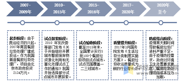 我國的餐廚垃圾處理行業(yè)起于2007年,經(jīng)歷了試點探索階段、試點驗收階段、質(zhì)量提升階段,再到近年來的與防疫結(jié)合,總共經(jīng)歷了如下五個階段,