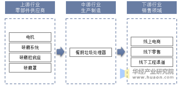 中國廚余垃圾處理器產(chǎn)業(yè)鏈較為清晰,上游為零部件供應(yīng)商,主要為電機、研磨系統(tǒng)、研磨腔底座、研磨罩等;產(chǎn)業(yè)鏈中游為廚余垃圾處理器生產(chǎn)企業(yè);產(chǎn)業(yè)鏈下游為銷售渠道,主要為線上電商、線下零售、線下工程渠道。