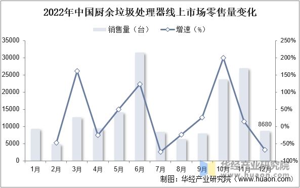 2022年中國廚余垃圾處理器線上市場零售量變化
