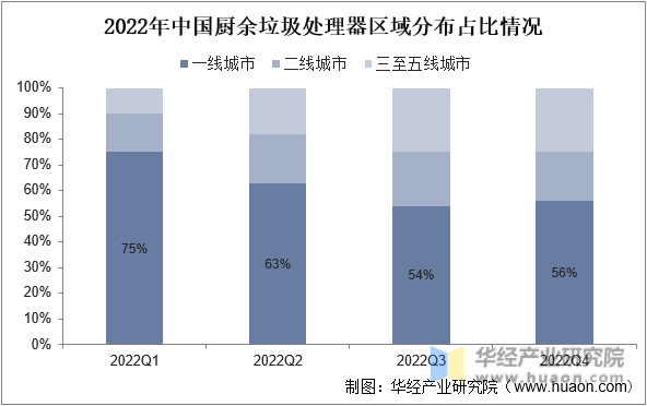 一線城市的生活垃圾污水處理能力強、污水管網(wǎng)發(fā)達,成為廚余垃圾處理器的主要市場。但2022年中國廚余垃圾處理器向二三線城市發(fā)展,擴寬行業(yè)市場,根據(jù)數(shù)據(jù)顯示,2022年一線城市市場份額逐年減少,2022年Q4一線城市份額為56%。