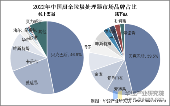 目前廚余垃圾處理器中以貝克巴斯、愛適易、唯斯特姆等為代表的垂直專業(yè)類品牌競爭優(yōu)勢明顯,2022年廚余垃圾處理器線上市場前10品牌零售額集中度達85.4%,較上年同期上漲2.3%,廚余垃圾處理器線下市場前10品牌零售額集中度達96.4%,較上年同期上漲1.6%。其中貝克巴斯品牌不管是線上還是線下渠道占比最重。